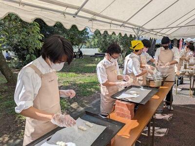午前中の校内はまだウォーミングアップ状態です。サークルの仕事に慣れながら、お客さんの対応もしていきます。それでも飲食店は最初からある程度のレベルはクリアしていなければなりません。お菓子系からがっつり系までメニューは多様です。生徒たちはさらに腕前を上げていきます。お昼頃には混雑や行列もあちこちで見られました。