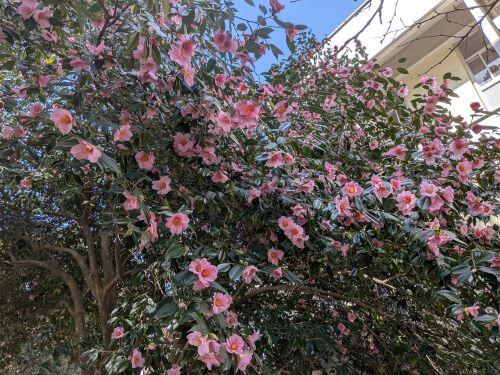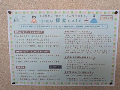 各教室に目を引く掲示物がありました。学年自習室、芸術選択の発表会、大学入試情報誌の無料プレゼント、進路イベント、新入生歓迎黒板アートの誘い、探究café、春期講習…。高3の教室には卒業生の息づかいが感じられる作品が残されていました。明法のキャンパスのあちらこちらで花が咲き始めています。(花粉も舞っています…)