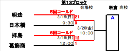 3月15日(日) 春季東京都高等学校野球大会一次予選の1回戦、日本橋高校との試合が行われ、21-0(5回コールド)で勝利し代表決定戦へとコマを進めました。