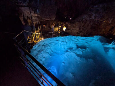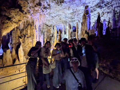 空港から徒歩で観光バスのりばまで移動し、最初の訪問先である沖縄ワールドへ。はじめに園内の玉泉洞という鍾乳洞890mを歩いて見学。鍾乳洞の神秘的な景色を生徒たちは写真に収めていました。