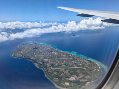 8:00に羽田空港に集合し、沖縄那覇空港へ。飛行機が空港に到着する間際。窓から沖縄のきれいな海が見えてくると、「海きれい! 海の水飲んじゃいたいくらいだ!」と話す生徒もいました。