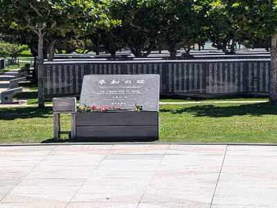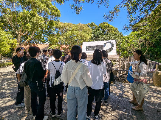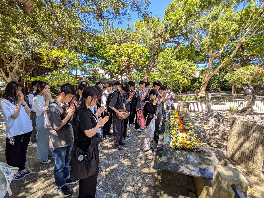 続いて、ひめゆり平和祈念資料館を訪問しました。まずは、資料館の前にある井原第三外科壕のあとにある「ひめゆりの塔」に献花をし、全員で手を合わせました。資料館に入ると、生徒と同世代の女子学生たちがどんな悲惨な体験をしたのかということを目の当たりにし、真剣に資料や動画に向き合っていました。