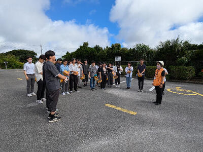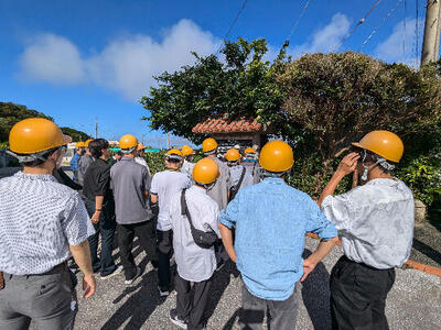ガマを出たところで、ガイドの方のご指導のもと、全員で黙祷を捧げました。