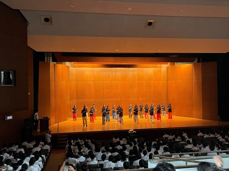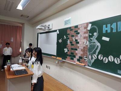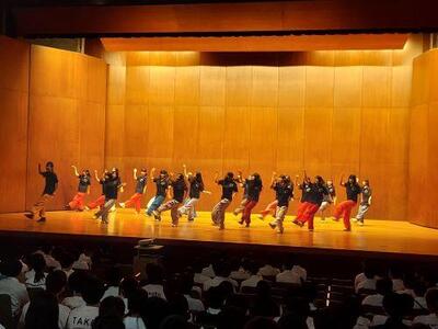 本日、第61回明法祭が幕を開けました。あいにくの曇天模様ですが、早朝から多くの生徒が登校し、最後の仕上げに取り組みました。8:40に全生徒は講堂集合、まずは明法祭実行委員会より実務的な連絡がなされます。祭り前の高揚感が漂う中、皆、意外なほど静かに聞いています。続いてダンス同好会のパフォーマンスが披露され、雰囲気が盛り上がった後に各サークルの活動場所へと散っていきます。