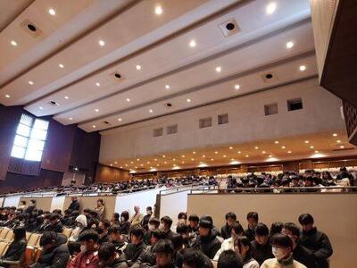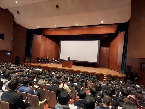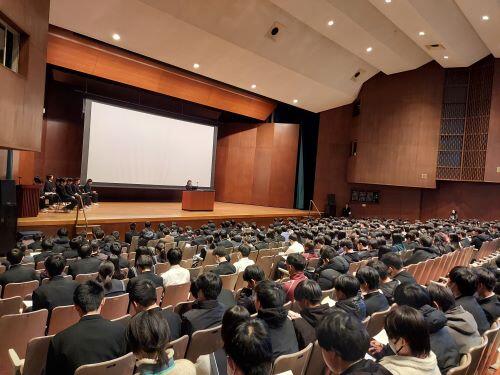 3限終了後、全生徒は筆記用具を持って講堂に集合します。舞台上には応援演説を行う生徒と立候補者が着席しています。司会の進行に従い、次々と推薦の言葉や公約が語られていきます。委員会同士のコミュニティーの構築、生徒の意見を学校側に伝えるためのアンケートの電子化、不要品の活用、地域との交流、どの生徒も役職の意味を深く考え、責任感を持ってこの場に臨んでいることが伝わってきます。全員の演説終了後に投票用紙を各クラスの選挙管理委員が回収します。開票・集計は放課後、評議・監査委員の立ち会いのもとに、選挙管理委員全員で行います。明法の良き伝統「生徒自治」の根幹をなす生徒会役員選挙は非常に厳格に行われています。