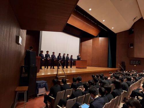 教室での担任の登場、点呼の後に、新しく指定された講堂の座席で始業式に臨みます。新任の先生の紹介には生徒たちも興味津々です。壇上の先生方の緊張した姿はよい話題になるでしょうね。校長先生の話は外見や話し方が第一印象では重視されるということに触れながらも、それ以上に長くつきあっていく上での対話や多様性、相手のいいところを見ることの大切さを語りかけました。最後に困っている人を助けた明法生についての電話があったという嬉しい話題が伝えられました。続く生徒朝会では部・同好会長と昨年の各委員長への伝達がありました。新年度を迎え、生徒会の組織も代替わりします。新しい視点や工夫も生まれるでしょうね。
