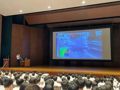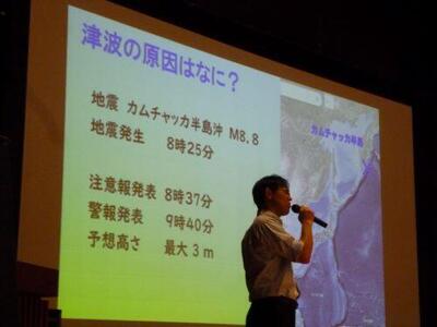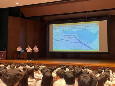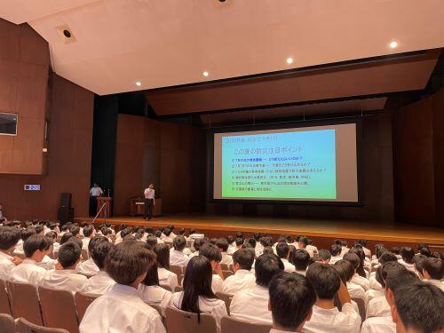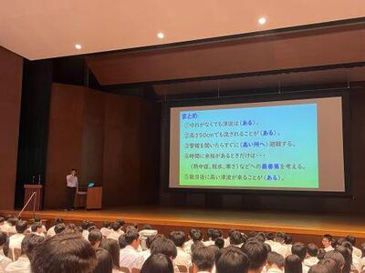 小休止をはさんで今年度2回目の防災訓練に移ります。7月30日の津波警報に関連して、今回は津波についての詳しい解説と、その対処法の説明がありました。実際に海岸近くで津波警報に遭遇した生徒や教員も壇上に上がり、自らの体験を話しました。数時間に及んだ避難の実状を直接聞くことは、貴重な経験となりました。「知る」ことで「防げる」ことがあります。今日、学んだことを家庭内でも共有してほしいと願います。