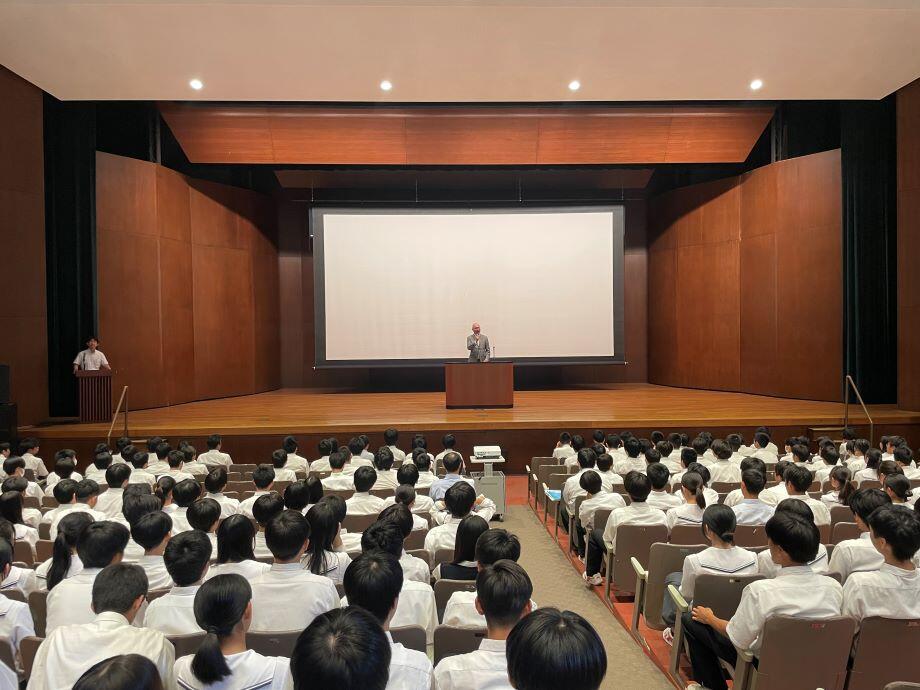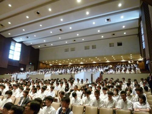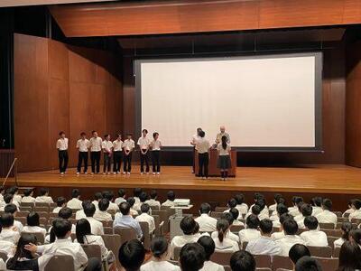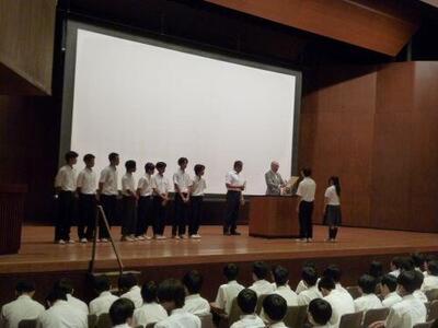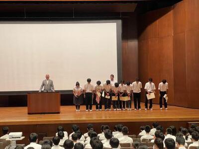 教室での点呼の後に講堂で始業式を行います。校長先生は「自己効力感」を中心とした話をしました。新しいことへの挑戦、失敗を恐れない、できない理由ではなくどうしたらできるかを考える、周りの人に助けを求める、学校の枠にとどまらない有用なアドバイスがありました。始業式後は表彰、夏休み中に文化部も運動部も充実した活動をしていたことがうかがわれました。