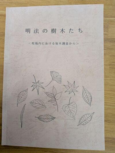理科の方から「明法の樹木たち〈校地内における毎木調査から〉」という資料をお借りしました。本校の理科教員が明法のすべての樹木を調べたものです。木の種類、生えている位置、高さや太さが記された資料を見ると、その調査の熱量に圧倒されます。