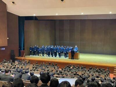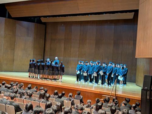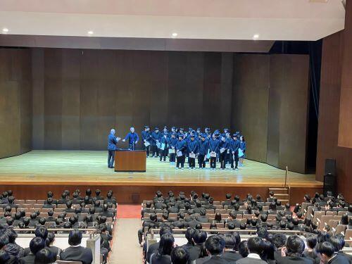 教室での点呼後に全生徒は講堂に集まり、始業式に臨みます。続く生徒表彰では運動系・文化系の多くの生徒が壇上に上がりました。全国レベルの大会もあれば、地域レベルの大会もあります。いずれも自らの目標に向けて努力した結果であり、尊いものです。
