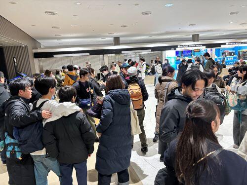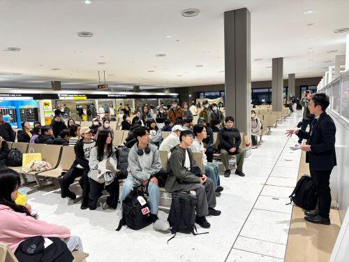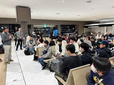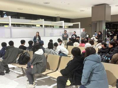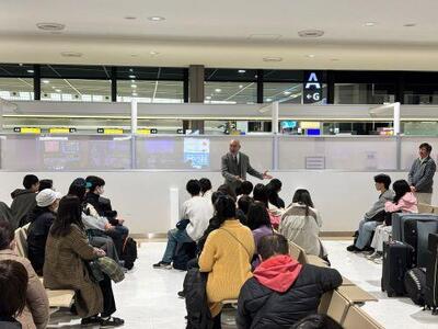 生徒の中には、今回が初めての海外、さらには飛行機に乗るのも初めてという生徒もいます。生徒たちは集合時刻の30分前には全員空港に集合。直前オリエンテーションや出国準備が始まりました。不安そうな表情を見せていた生徒も、楽しみな様子で談笑する生徒もいました。着々と出国準備は進み、出発式で担当教員や校長からのメッセージ、そして集合写真の撮影も完了。いよいよ搭乗ゲートへ向かう時間になりました。友人や先生方と写真を撮ったりする生徒もいれば、総出で見送りにきた家族と出発前最後の会話を名残惜しそうにしたり、涙を流したりする生徒もいました。