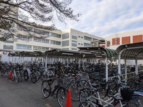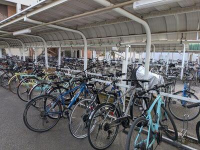 自転車チェックでは登録と施錠を確認します。明法には広い駐輪場があり、多くの生徒が自転車通学をしています。生徒たちは自転車保険に加入し、通学登録をして登録ステッカーを貼ることがルールです。校内での自転車安全講習にも参加しなければなりません。