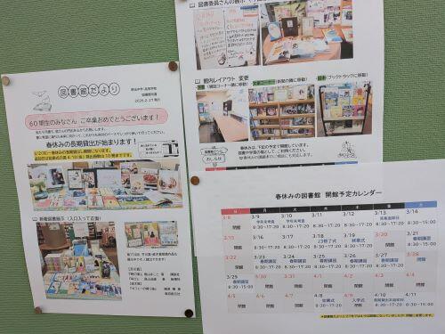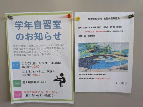 各教室に目を引く掲示物がありました。学年自習室、芸術選択の発表会、大学入試情報誌の無料プレゼント、進路イベント、新入生歓迎黒板アートの誘い、探究café、春期講習…。高3の教室には卒業生の息づかいが感じられる作品が残されていました。明法のキャンパスのあちらこちらで花が咲き始めています。(花粉も舞っています…)